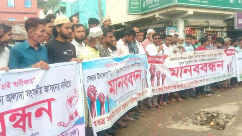 শনিবার (২৩ আগষ্ট ) বিকালে উপজেলার বেলাব বাজার শাপলা চত্বরে “স্বতন্ত্র সংসদীয় আসন বাস্তবায়ন পরিষদ” এর ব্যানারে উক্ত মানববন্ধন অনুষ্ঠিত হয়।